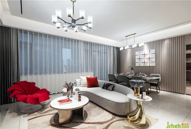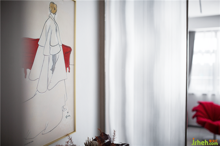 這是一個(gè)上層疊墅樣板房,以極具女王氣場(chǎng)的Dior999紅,作為空間的主角,營(yíng)造自信、灑脫的開場(chǎng)白,高調(diào)的紅與低調(diào)的灰,兩種極致的時(shí)尚色系相互碰撞,呈現(xiàn)一個(gè)新興雅致的時(shí)尚況味。紅色的沙發(fā),恰如一朵盛放的紅色玫瑰,展示秀美瑰麗的絕代芳華。