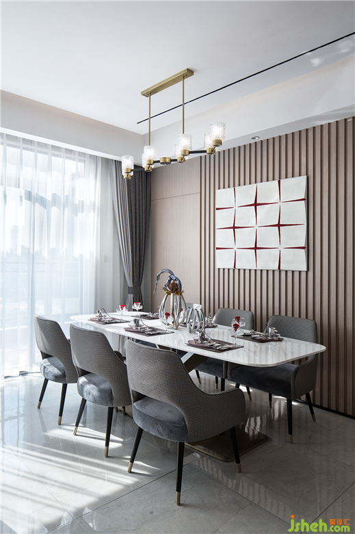 真正的奢華隱匿于細(xì)節(jié)的雕琢之中,餐廳背景墻上的飾畫,通過紅色線條序列分隔成一個(gè)個(gè)立體的格子,與餐椅的千鳥格紋圖案凝練成趣味、優(yōu)雅的對(duì)話,自然而富有美感。