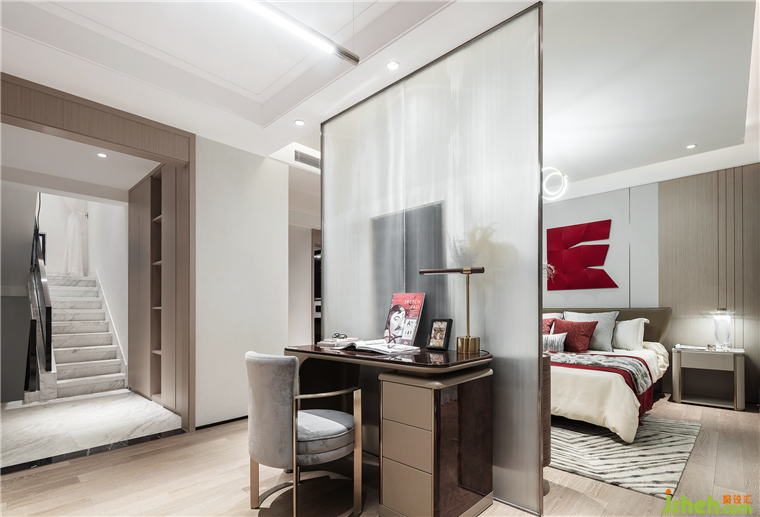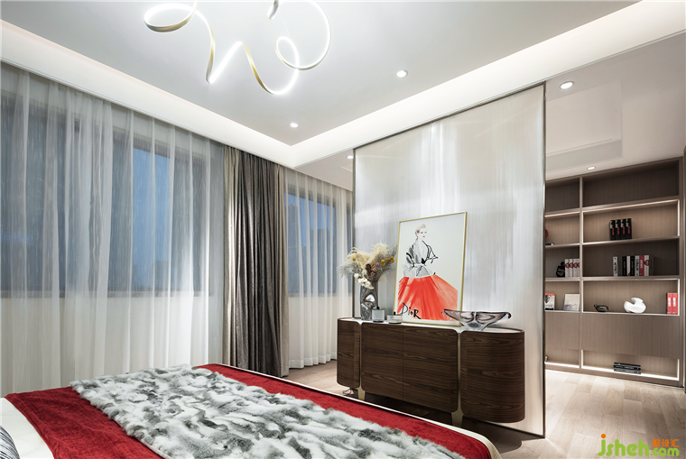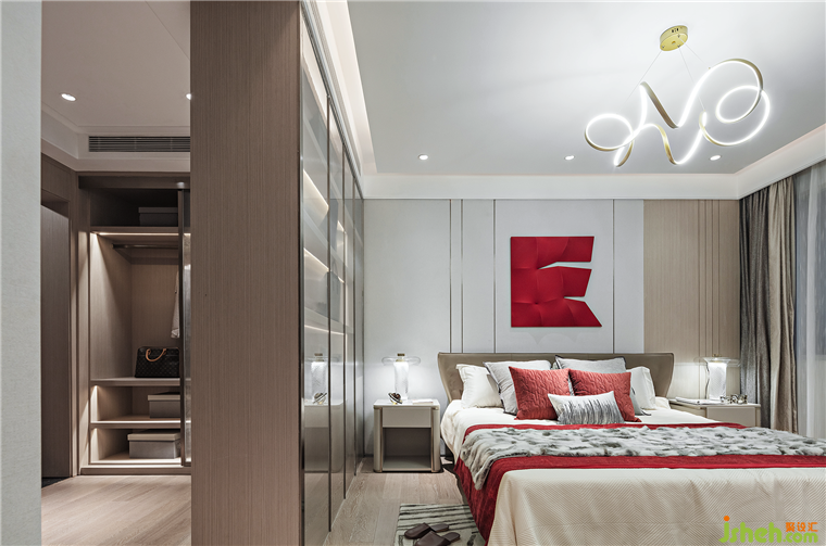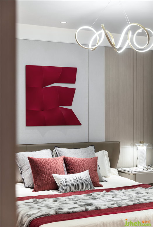 主臥室中紅色依然是最閃耀的存在,濃淡不一的紅色與質(zhì)樸的木形成涇渭分明的對(duì)比,在熱情與內(nèi)斂之間,極具曲線美的蜿蜒吊燈,以極致的優(yōu)雅,中和了空間的氣質(zhì),色彩濃度及材質(zhì)的調(diào)制,一切都恰到好處。