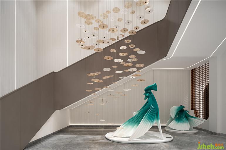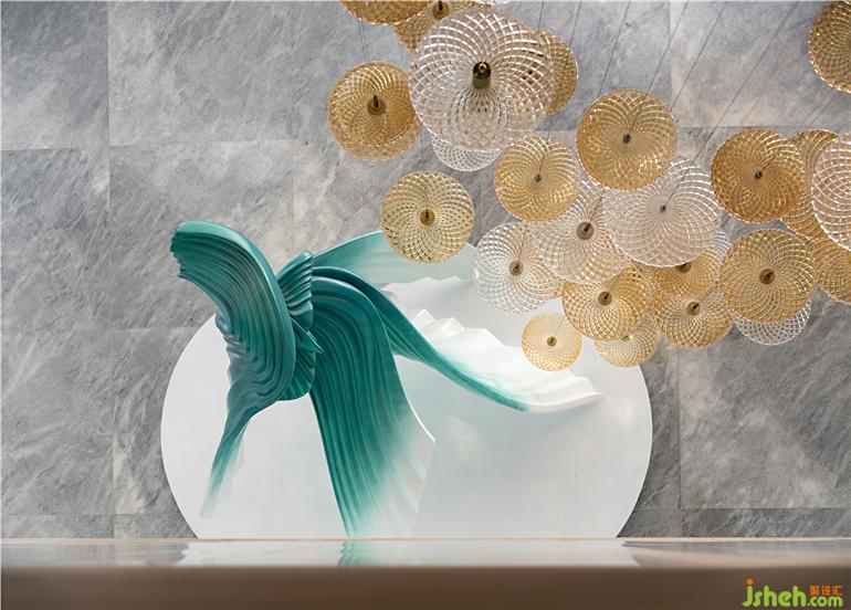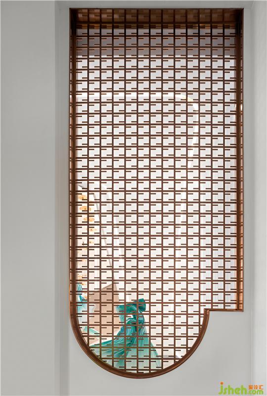 本案營銷中心設(shè)計以流行色米色為基調(diào),呈現(xiàn)上海文化的雅致與高級基調(diào),參考老上海建筑和平飯店、旗袍、團扇、黃浦江、黃包車等元素,試圖帶領(lǐng)來訪者重新穿越到四五十年代的老上海芳華。墻面借鑒時光長廊的拱門設(shè)計,有著撲面而來的復(fù)古風(fēng);以旗袍文化復(fù)刻老上海裝飾藝術(shù)派的高雅精致腔調(diào),雕塑以飄逸的裙擺,旋轉(zhuǎn)的曲線展示摩登女性魅力,體現(xiàn)東方的韻味與西方的浪漫糅合碰撞。室內(nèi)椅子、枕頭等家私上多處以細節(jié)營造出上海風(fēng)情雅致,有黃埔江上江水滔滔,貨船川流不息,江邊黃包車、小汽車來來往往,載著商圈名人、摩登小姐來到和平飯店,將這座城所獨有的氣息濃縮在此。