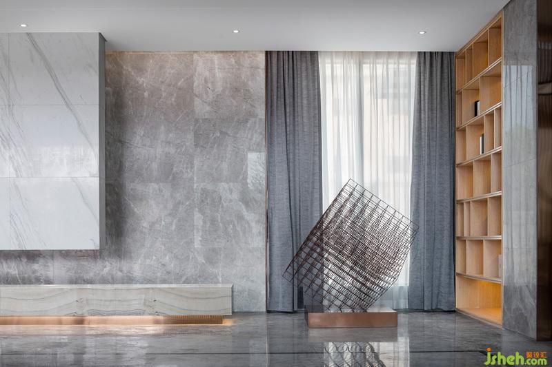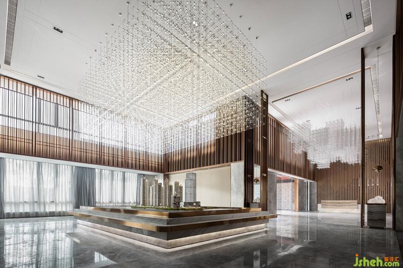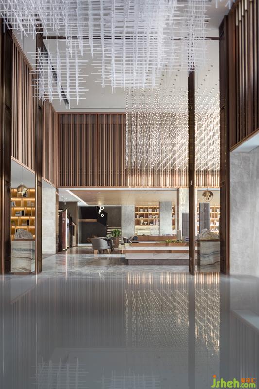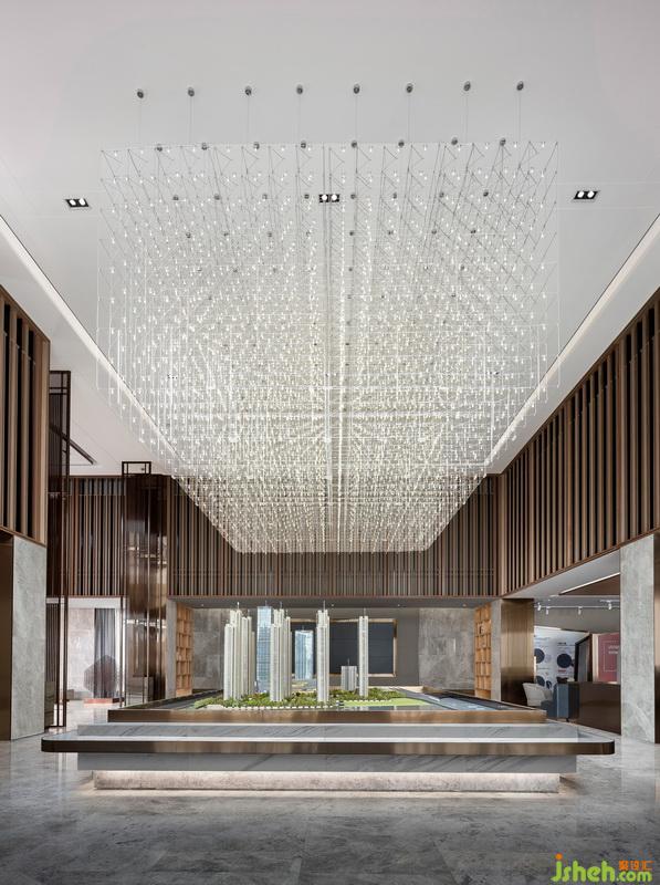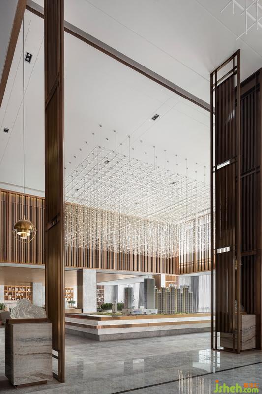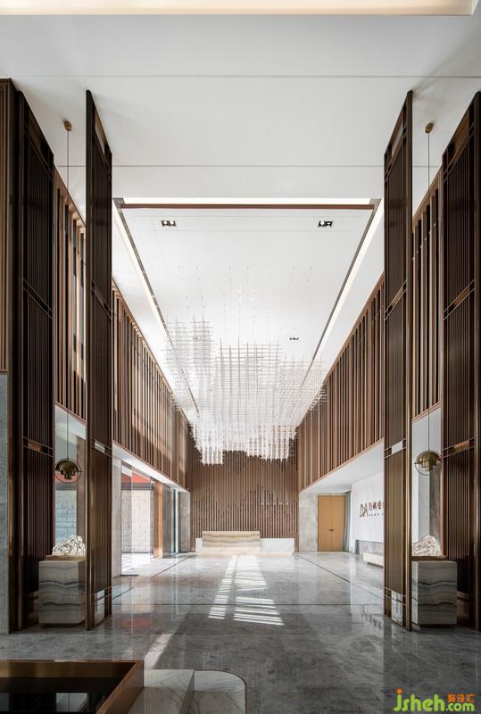 進(jìn)入接待前廳,入眼便是淺色大理石背景體塊與地面對比所帶來的視覺沖擊。自然光穿透木格柵在地面映下斑駁光影,強化了空間入口的互動性與儀式感。接待臺室內(nèi)設(shè)計師引用建筑穿插手法,將水紋肌理的玉石點綴其中。細(xì)看接待臺背部立面,“長江之水”的圖紋融入石材與木格柵深淺韻律,亦如暗示訪客,這場“停留”之境的序幕已漸漸拉開。