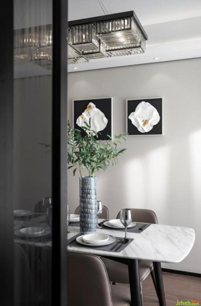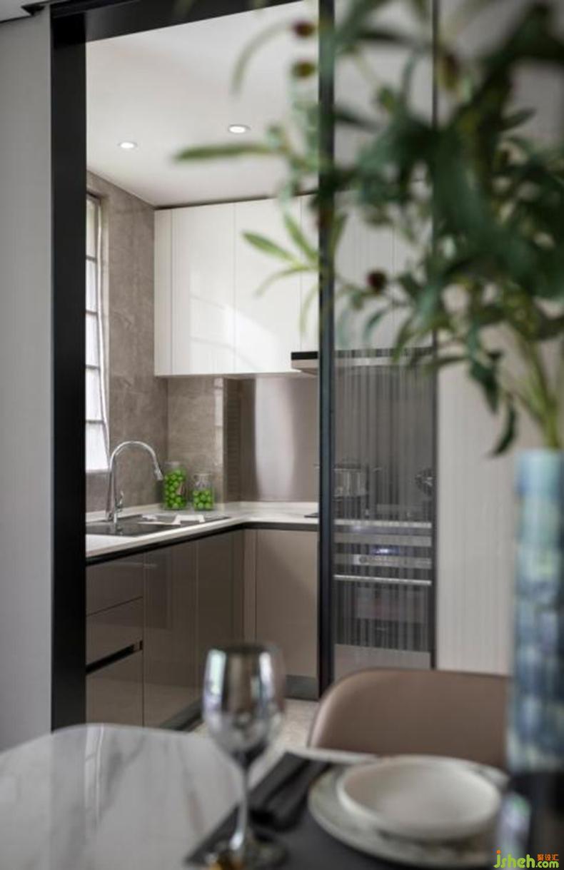 客餐廳呈狹長式布局,在立面與吊頂連接處,融入黑色金屬嵌條,既起到明確吊頂、墻面、地面三者關(guān)系的作用,又增加整體層次感。木質(zhì)背景墻的暗門設(shè)計(jì),保證了視覺一體呈現(xiàn)。陽臺(tái)玻璃移門如同天然背景,引入充足陽光,同時(shí)與室外景色虛實(shí)交替,感知生命的活力。肌理感明顯的玻璃移門實(shí)現(xiàn)餐廳與廚房的串聯(lián)與分割,靈活塑造出空間韻味。室內(nèi)設(shè)計(jì)師