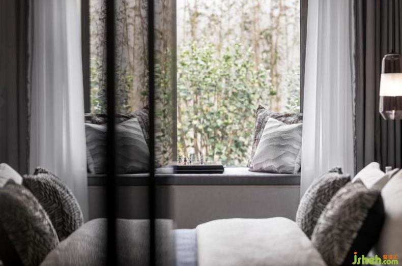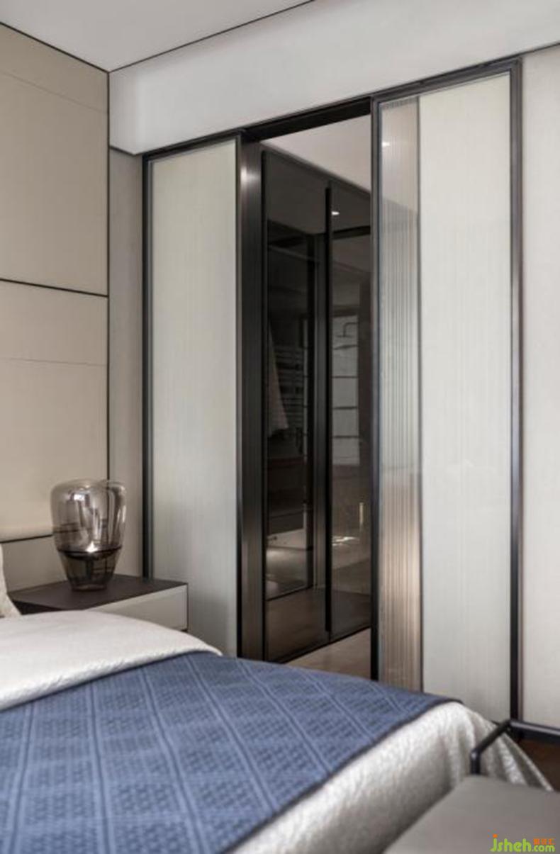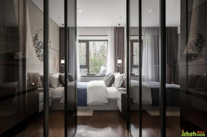 步入式衣帽間,灰色玻璃代替實(shí)質(zhì)柜門,實(shí)現(xiàn)交相映射,有效提升空間通透感,且極富趣味性與神秘感。