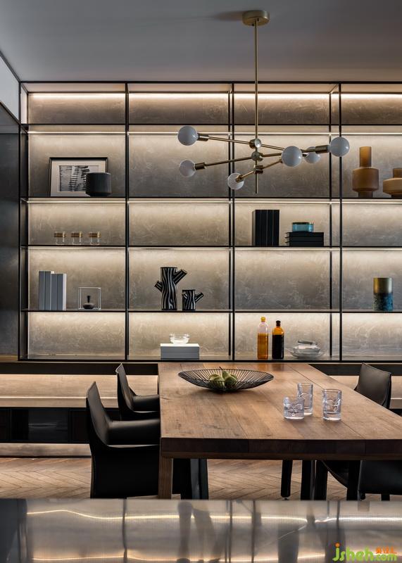 從玄關(guān)進(jìn)入便是開(kāi)放式格局,客餐廳與廚房一覽無(wú)余。飽含珍重記憶與情意的長(zhǎng)桌是陸導(dǎo)心愛(ài)之物,與魚骨拼地板相得益彰,舊物件和諧融入新空間,營(yíng)造出別致韻味。由6mm金屬層板定制而成的格架與燈帶相輔相成,賦予空間獨(dú)特光影魅力。