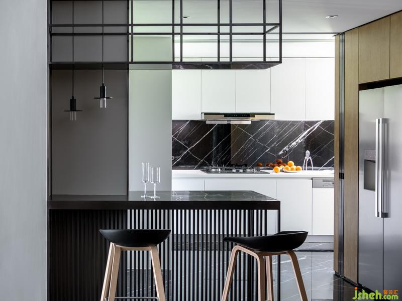 室內(nèi)設(shè)計(jì)師方磊一改原本面積局促的廚房,以黑白為主基調(diào),預(yù)留錯(cuò)落有致的操作臺(tái)面。半敞開(kāi)式結(jié)構(gòu)與客餐廳產(chǎn)生互動(dòng),亦可靈活使用暗藏玻璃移門,既隔斷油煙,又確保通透。