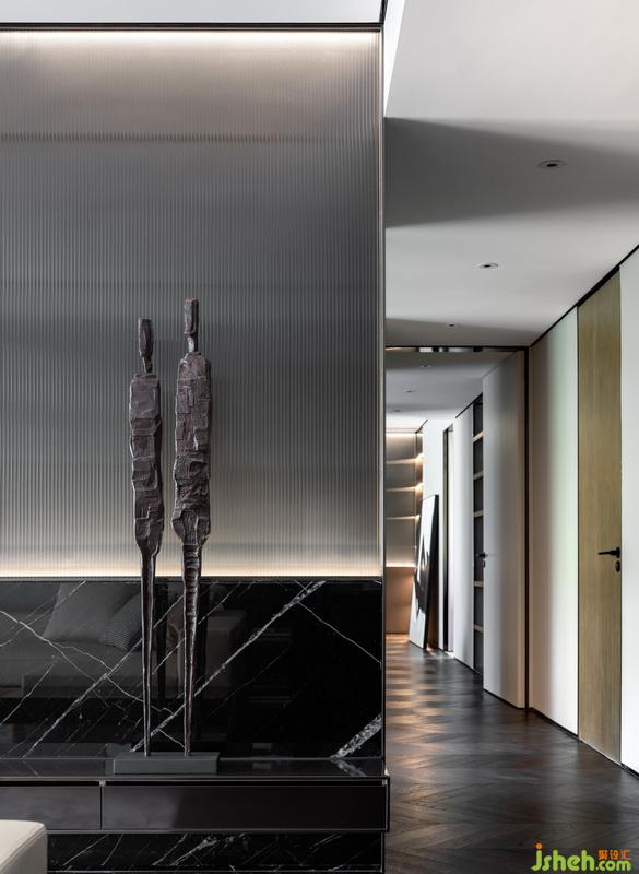 出于陸導(dǎo)職業(yè)習(xí)性考慮,利用刻花玻璃內(nèi)嵌線型燈帶勾勒電視背景墻,猶如舞臺(tái)上的幕布,為業(yè)主營(yíng)造休閑狀態(tài)下關(guān)注娛樂(lè)動(dòng)向的儀式感。雕塑與藝術(shù)畫,帶來(lái)精神世界的營(yíng)養(yǎng)供給。