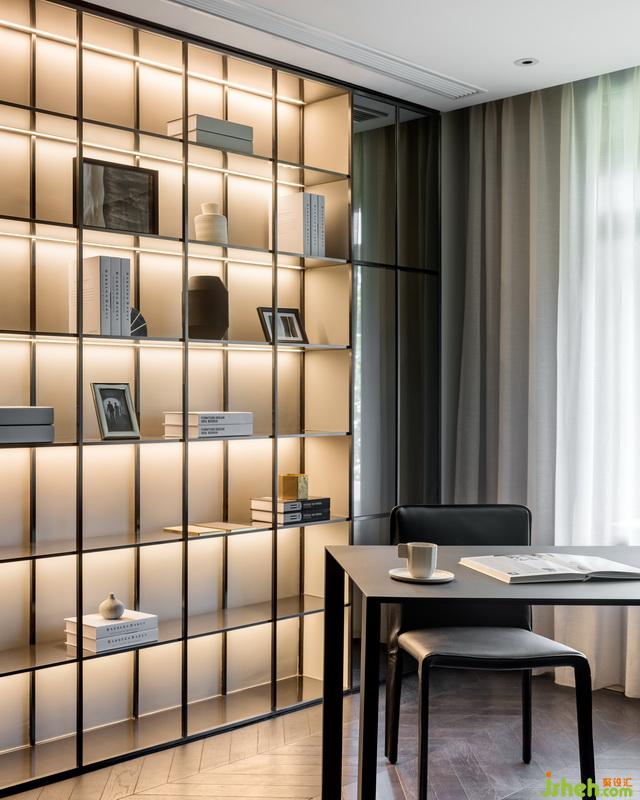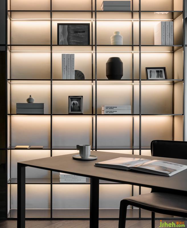 移除書房原結(jié)構(gòu)中非承重墻作為暗門門洞,開(kāi)放與私密并存。嵌入墻壁定制格架,最大化利用面寬有限的書房空間,輔以內(nèi)置燈帶,氤氳出現(xiàn)代美學(xué)氣息,滿足陸導(dǎo)閱讀或創(chuàng)作訴求。格架對(duì)面非承重墻延續(xù)同樣的改造手法,設(shè)置隱藏式折疊床,可供親友短居,實(shí)現(xiàn)空間靈動(dòng)轉(zhuǎn)換。