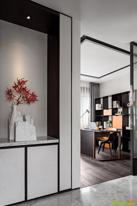 書架以虛實結(jié)合的體塊感呈現(xiàn),疏密不一,相異的色調(diào)在橫縱間碰撞交錯,演繹靈動隨性之美,讓收納和展示一舉兩得,同時豐富了空間機能。踱入書房,這一隅是閱讀、辦公最好的場所。