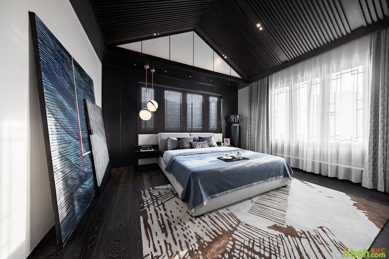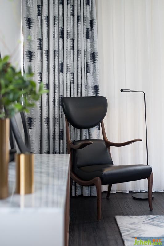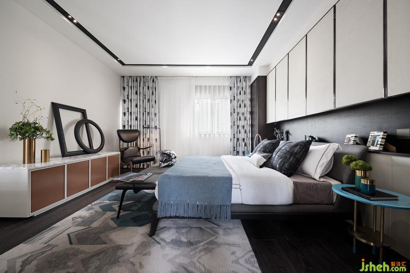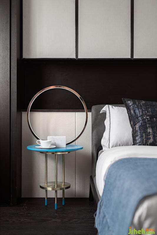 二樓次臥室內(nèi)設(shè)計師在陳設(shè)形式上摒棄了繁冗復(fù)雜的技巧,家私造型以簡潔硬朗的線條為主。汽車元素與皮質(zhì)、金屬、石材等碰撞,輔以藍色系修飾,增添了幾絲柔和,讓生活跟質(zhì)感達到完美平衡。