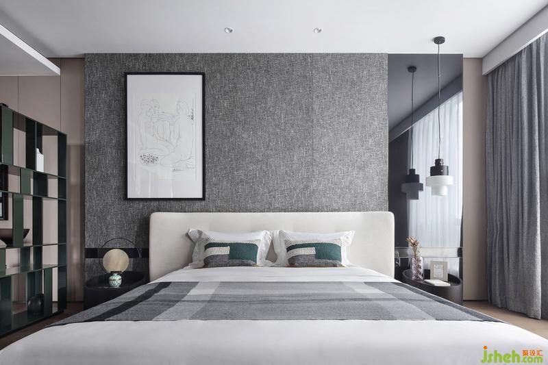 次臥將灰色調(diào)在空間中發(fā)揮到極致,立面上簡(jiǎn)潔線條呈序列對(duì)望,完成靜謐、平和的情緒表達(dá)。