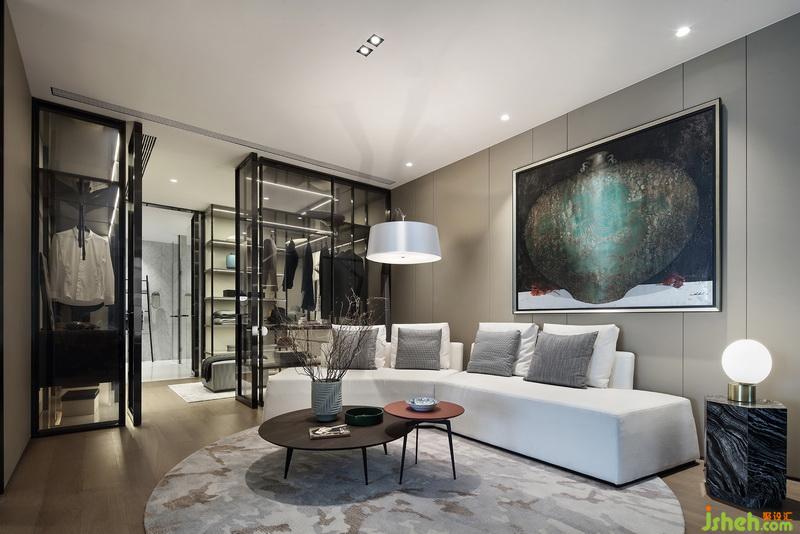 主臥套房?jī)?nèi)設(shè)起居室、衣帽間及主衛(wèi),各功能空間呈開放遞進(jìn)式布局。室內(nèi)淺咖色皮革、紋理感強(qiáng)烈的壁布與黑色鏡面碰撞,都市格調(diào)感油然而生。