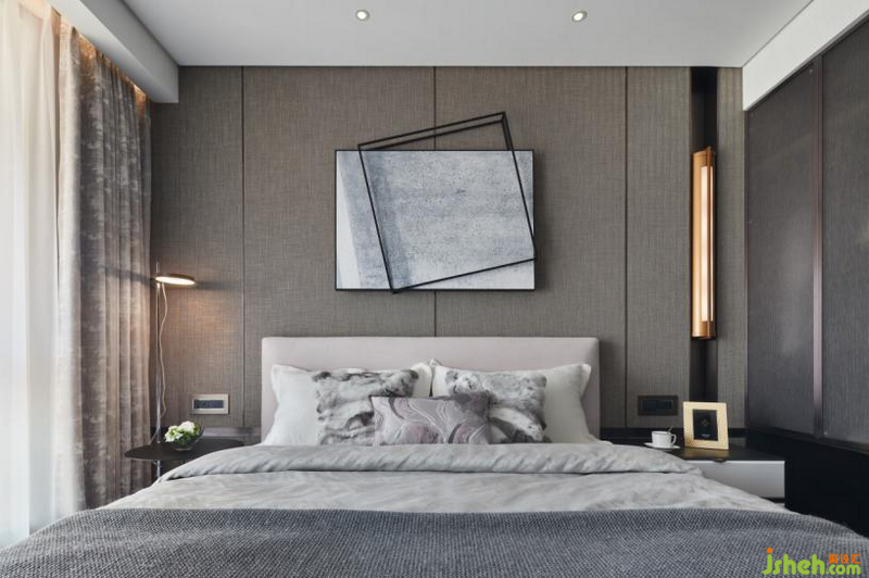 主臥以非對(duì)稱的視覺構(gòu)造手法,在金屬分割條的映襯下,隱約中呈現(xiàn)微妙的平衡感,整體平和舒適。懸浮狀衣柜以夾絲玻璃與金屬相結(jié)合,俊朗之余,又不乏飄逸靈動(dòng)。