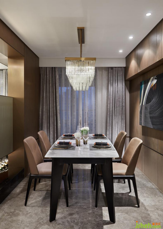 餐廳設(shè)計(jì)去繁存簡(jiǎn),在餐桌椅的選取和色彩搭配上,塑造深邃且溫潤(rùn)的就餐氛圍。