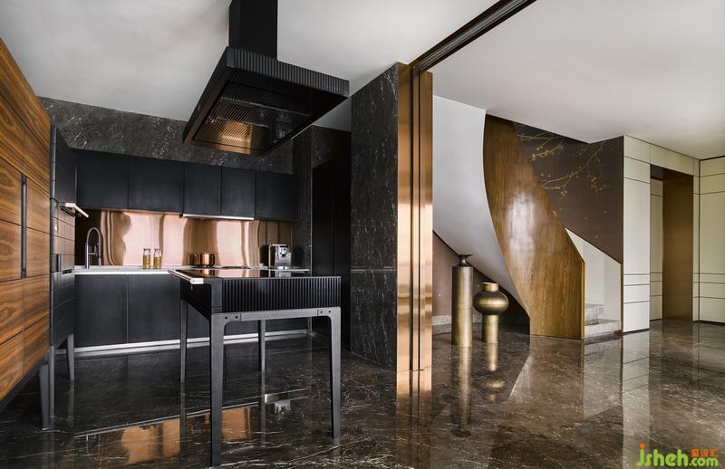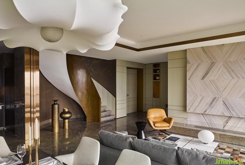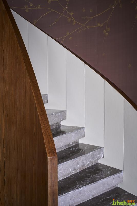 弧形樓梯蜿蜒而至,古銅擺件與立面手工壁紙自成一景。臺階拾級而上,將室內(nèi)與頂端露臺相連接,深色木材與皮革混搭,彰顯出對縫手法的魅力,讓情緒在不經(jīng)意間釋放。