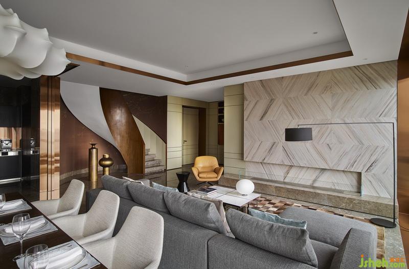 室內(nèi)通過石材、金屬、皮革等材質(zhì)的融合與對比,形成風韻現(xiàn)代與優(yōu)雅古典的對話,渲染出國際大都會的俊朗風度??蛷d以對紋理手法打造背景墻,豐富視覺觀感;壁爐升騰,暖意回升。窗外,精致璀璨的都市圖景盡收眼底,坐臥之間,遠觀近袛,皆融入城市的熱流。