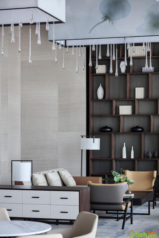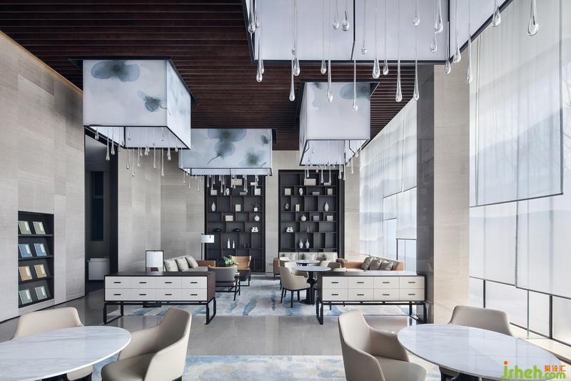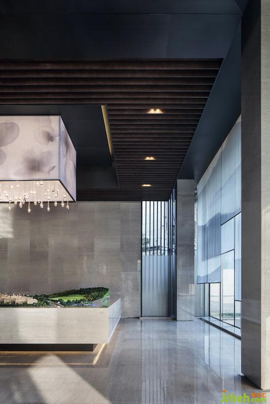 洽談區(qū)頂端延續(xù)沙盤區(qū)的手法,水墨暈染吊燈以體塊穿插于木格柵,其紋路似花瓣散落,又若云霧繚繞,而正要墜下的水滴狀進(jìn)一步提升其空靈意境。開敞式布局在收放自如中平衡著空間的取舍之道,色澤、形態(tài)、體量和諧融入整體空間,陽光透過簾幔映入其中,從立面到頂面,詩意的格調(diào)躍然而出。