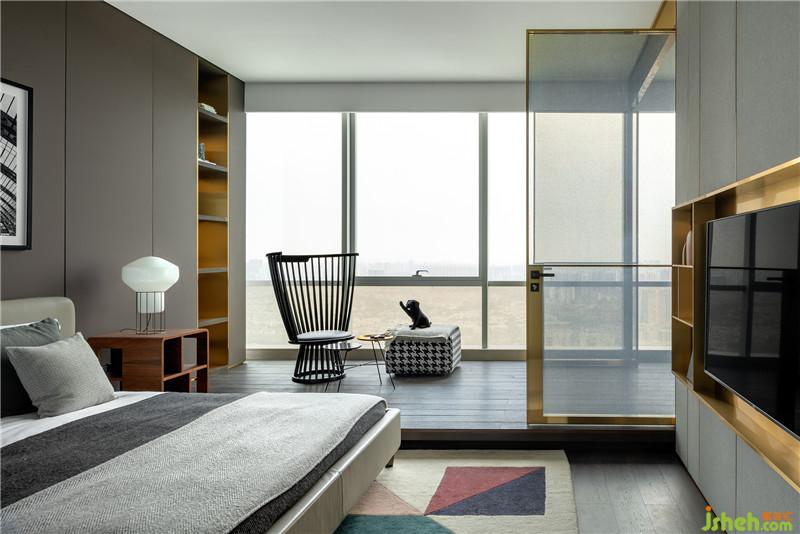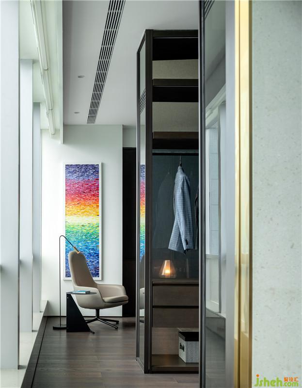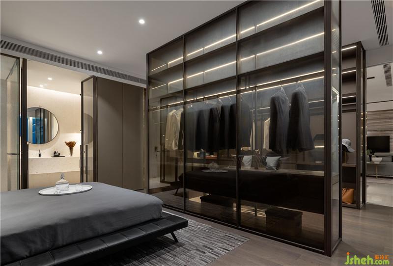 衣帽間與臥室的環(huán)繞型動(dòng)線讓整個(gè)空間更加聯(lián)動(dòng)、緊密,夾絲玻璃、鏡面的精心設(shè)置,虛實(shí)交融,讓空間有效舒展,又凸顯層次。