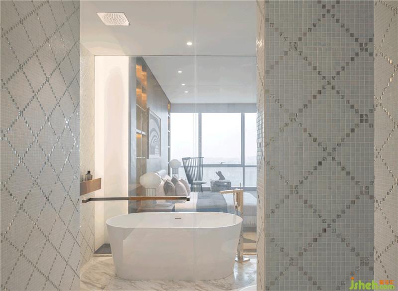 次臥衛(wèi)浴立面以馬賽克鋪呈,追尋從平面化到三維化的轉(zhuǎn)變,在精巧細節(jié)中透露出個性與時尚基因。以霧化玻璃分隔睡眠與衛(wèi)浴空間,拉伸了整個空間,強化了套間內(nèi)的流動性與呼吸感。