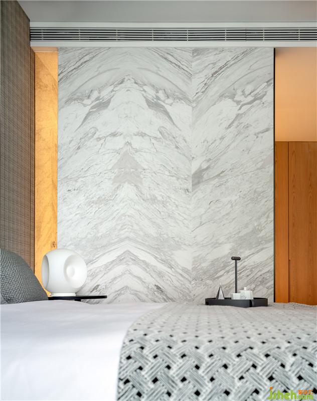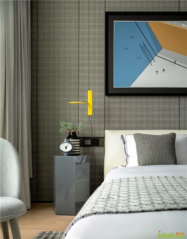 客臥套間以灰色系為主調(diào),床背景采用肌理明顯的壁布硬包,立面輔以線條造型,呈現(xiàn)韻律劃分。衛(wèi)浴空間以同色系大理石做隔斷,保留小范圍玻璃間隙,隔而不斷豐富空間層次。
