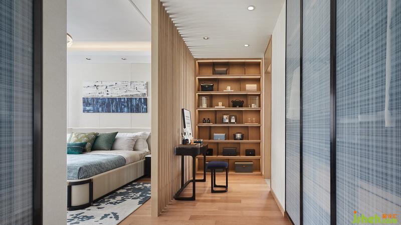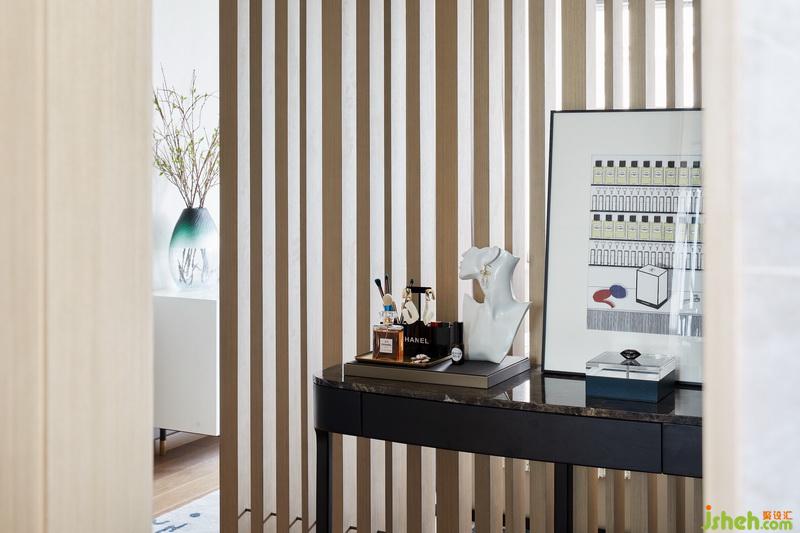 透過(guò)木格柵,主臥亦可一窺衣帽間的風(fēng)采。展示性與功能性兼并的衣帽間設(shè)立于走廊盡頭,室內(nèi)設(shè)計(jì)師在不經(jīng)意的筆觸中,將低調(diào)奢華的高貴感勾勒而出。