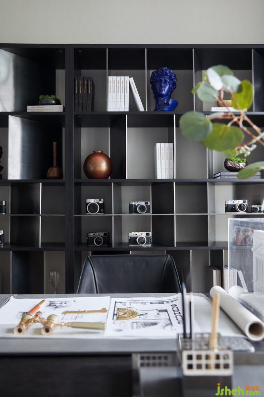 書(shū)房則以沉穩(wěn)為主基調(diào),不規(guī)則書(shū)架設(shè)立多樣陳列方式,格架大小不一,擋板傾斜角度各異,兼具功能、特色與美觀,同時(shí)便于物件和藏品的展示和存儲(chǔ)。