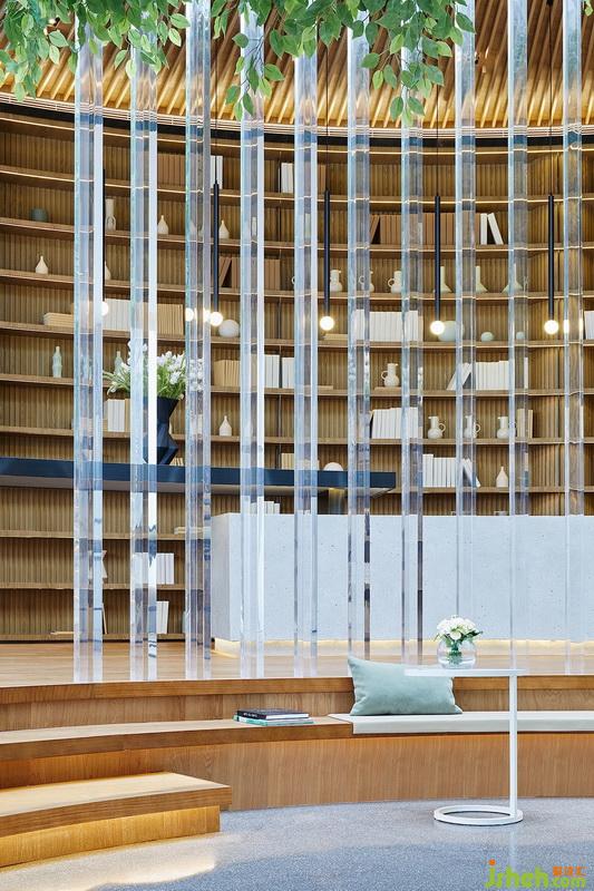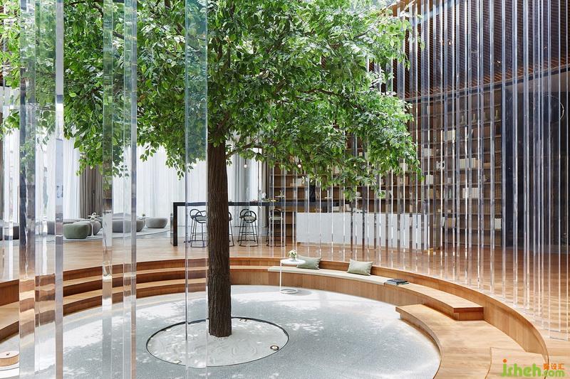 樹屋頂面木格柵呈放射狀向四周鋪陳,地面、立面均借由木質(zhì)與之遙相呼應(yīng)。陽(yáng)光透過(guò)頂端采光井灑入,內(nèi)外共生,經(jīng)由透明亞克力散射,配合多維的燈帶作用,構(gòu)筑極具韻律之感、且又伴有變化的光影效果。
