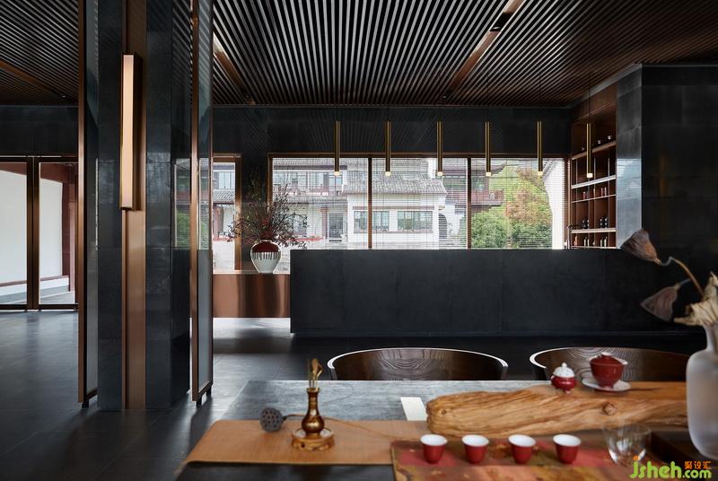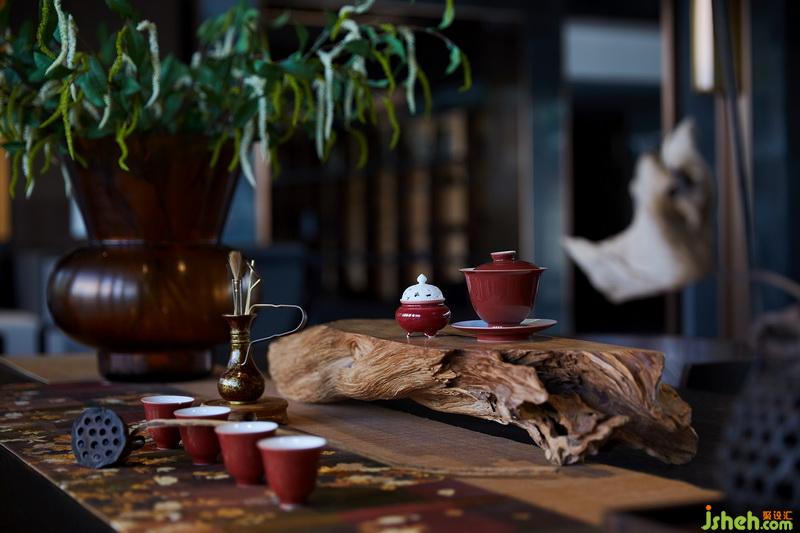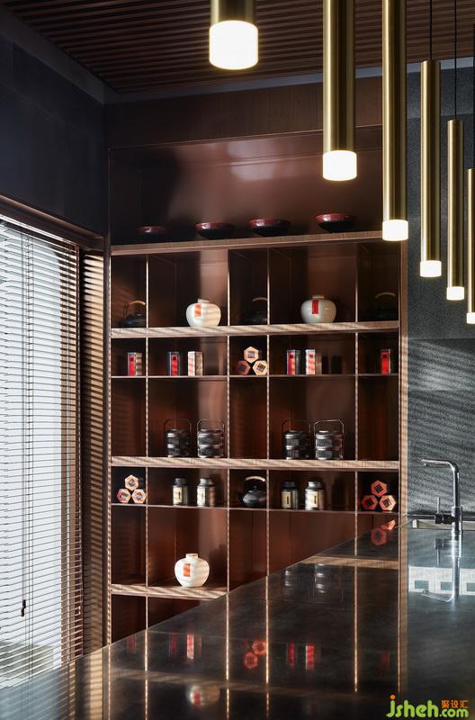 傳統(tǒng)古樸的根雕茶臺、日式絲織茶席,結(jié)合多樣材質(zhì)混搭,鋪展開一室古雅清愜。于此飲茶一甌,以裊裊升騰的水霧構(gòu)就品茗論道的精神棲居。水吧臺與茶室相對,茶文化展示架使用木格與金屬層板相交設(shè)置,以其跳躍性突破常規(guī)。