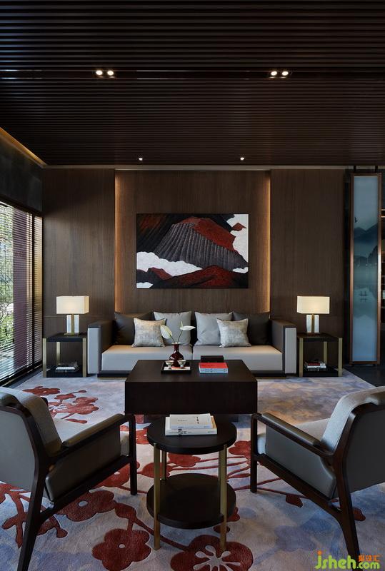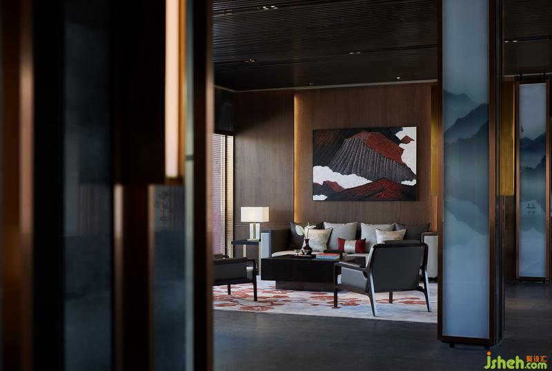 會客區(qū)處于中心茶臺兩端,對稱的手法、圍合的陳列、適宜的比例,實現(xiàn)多樣元素的碰撞演繹,剛?cè)岵?jì),飽含層次感。主背景木飾面嵌古銅,加上燈帶設(shè)置,顯得安靜而溫潤。