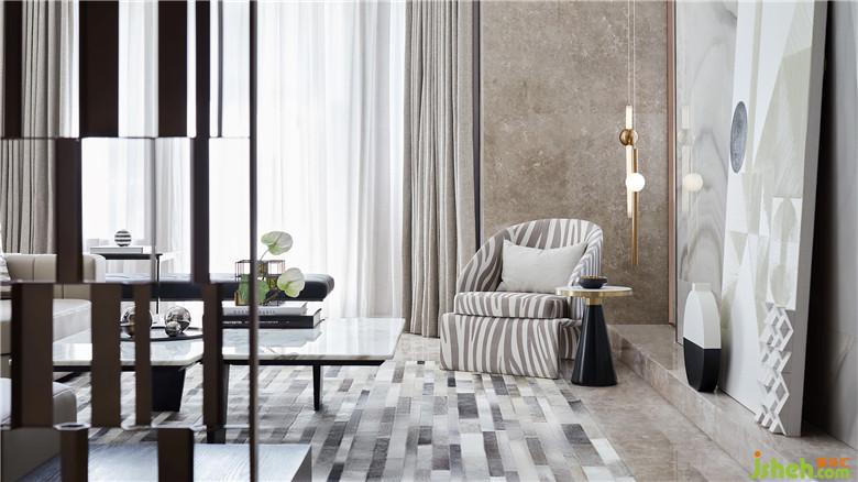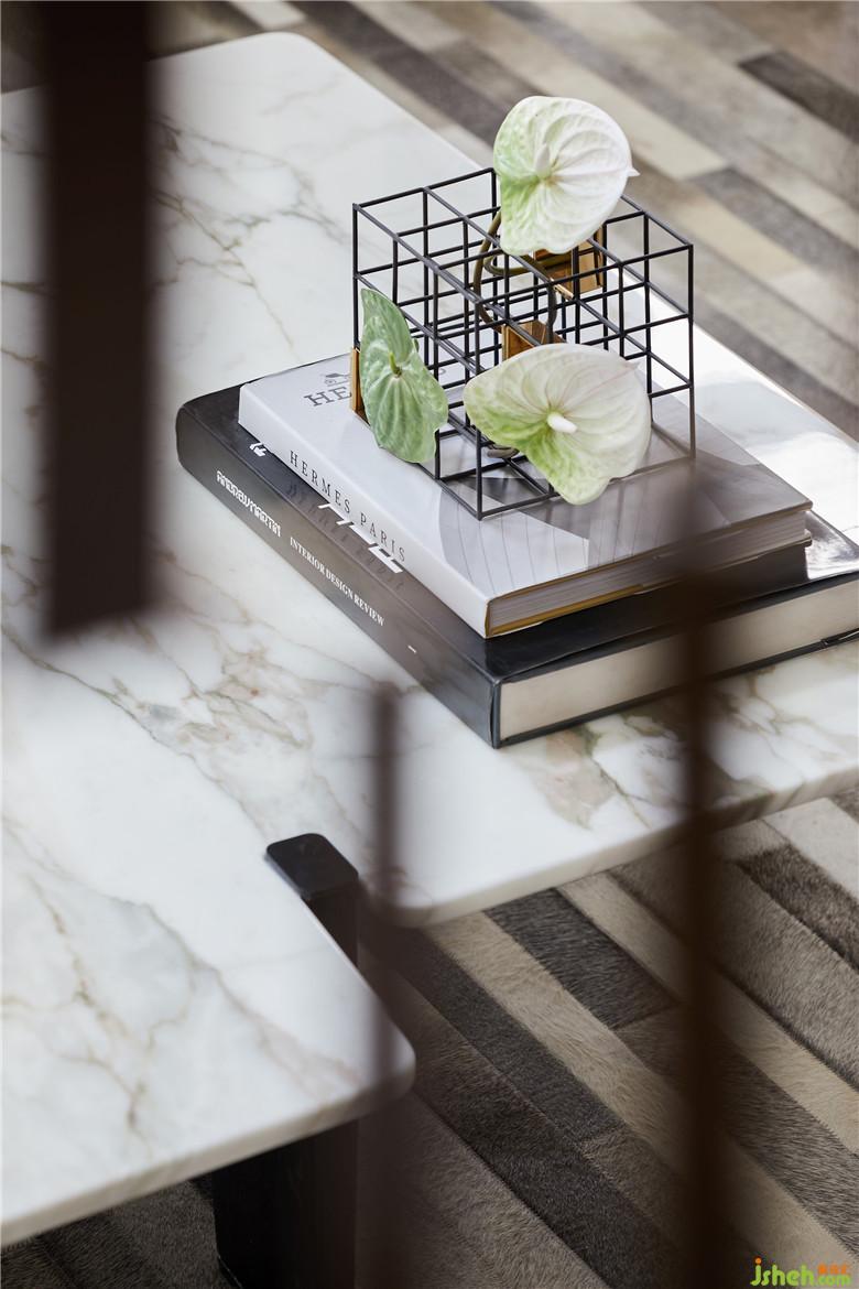 設(shè)計元素的呼應(yīng)與融合在此運用嫻熟:客廳兩端立面的畫作,均由黑白灰三色演繹,以簡約的筆觸勾勒藝術(shù)感知;背景線板與沙發(fā)都極具體塊與線條韻律,后方非常規(guī)尺寸的畫作將人的視線自然引向上方,銜接之余又散發(fā)出一種不可言說的魅力;條塊狀金屬屏風(fēng)衍生的錯位分割感,也在兩幅畫作、茶幾、牛皮拼接地毯上得到體現(xiàn)。