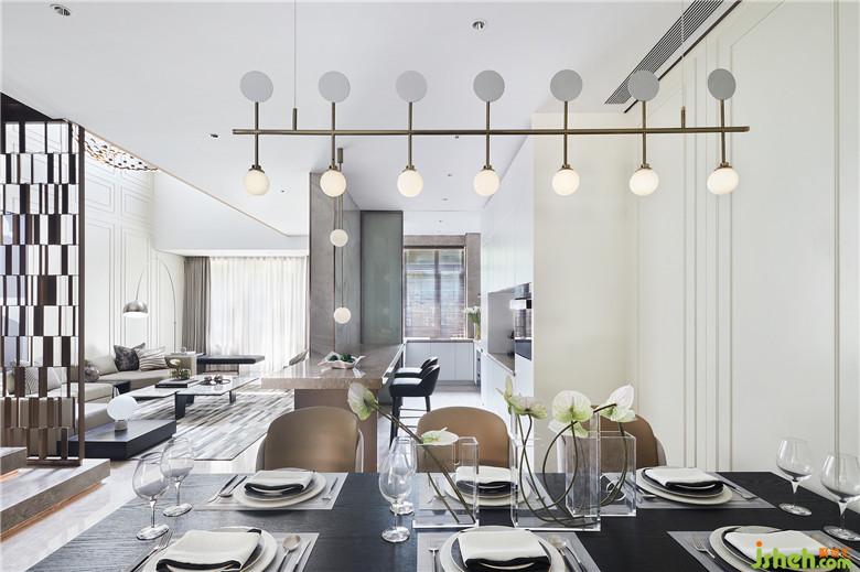 不同的材質(zhì)、造型、色澤于餐廳交織,錯落有致,立面沿用大塊面線板充當(dāng)最適宜的調(diào)色板,渲染出典雅且輕松的用餐環(huán)境。