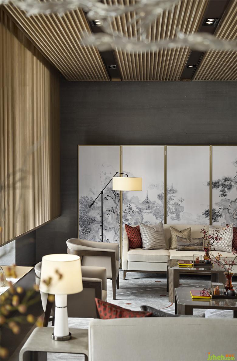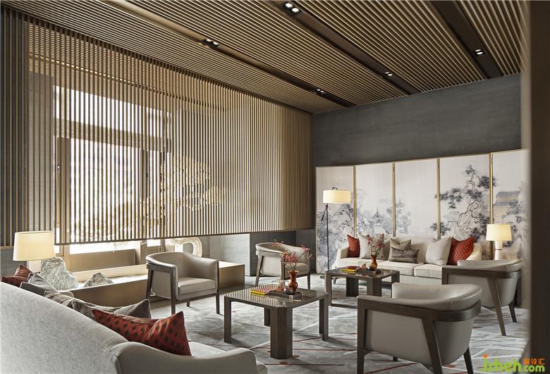 緊鄰淺度洽談區(qū)的一側(cè),設(shè)立深度洽談區(qū)與品茗區(qū),在半開(kāi)敞半私密的復(fù)合型布局中,木格柵材質(zhì)以橫豎并存的姿態(tài)出現(xiàn),更具韻律節(jié)奏。此外還引入園林造景技法,虛透中亦可一窺山石松林,領(lǐng)略到“窗前有風(fēng)景、心中有山水、茶中有天地”。