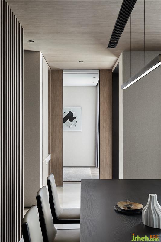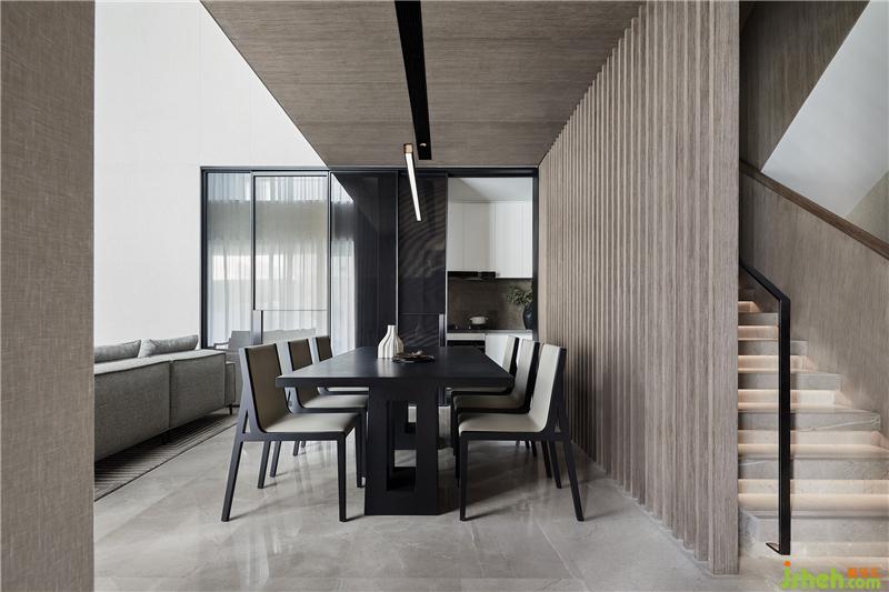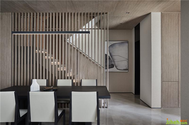 秉承了壹舍一貫的克制平衡之道,客餐廳避免過(guò)多元素堆積,在滿足需求之外,又透露出分區(qū)美學(xué)。挑高的一側(cè)立面如同階梯狀漸次內(nèi)退,餐廳因勢(shì)而生,這是尺度上的自然而然,也是對(duì)塊面關(guān)系的靈活統(tǒng)籌。