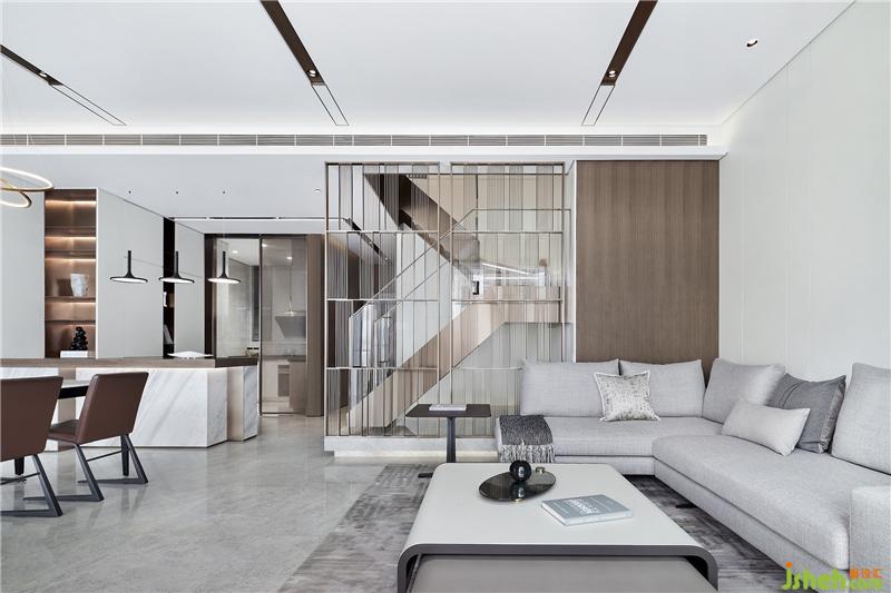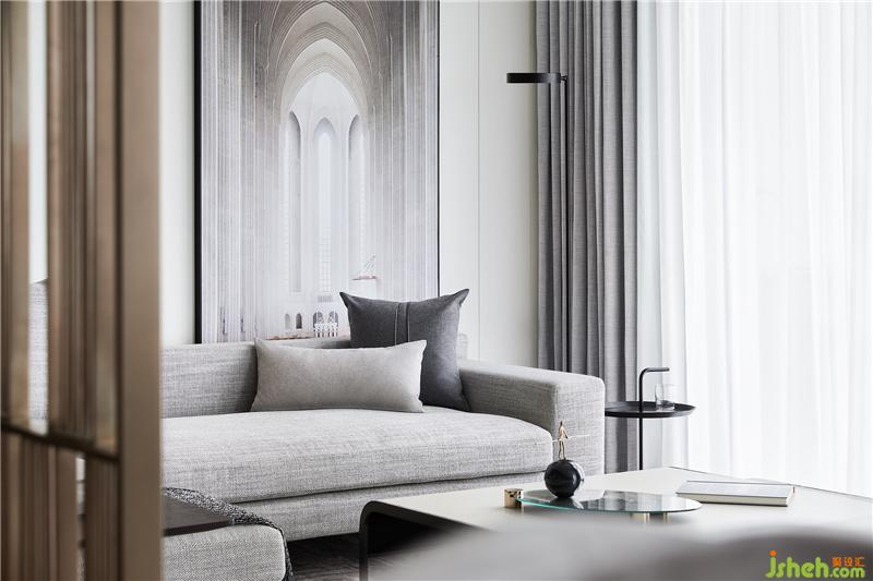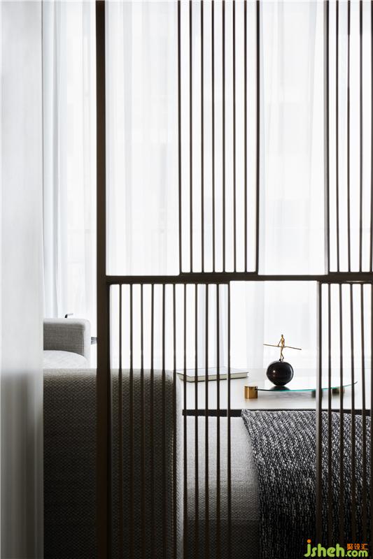 陽光透過窗紗,光線點點落于柔軟布料,這一瞬的客廳仿佛成了永恒。設計師摒棄虛張聲勢,舍了繁華堆砌,去除多余的墻體,借由金屬格柵的虛實效果,連接多個區(qū)域互通對話,簡潔的線條,溫和的色調,安寧地詮釋出靜謐輕奢的格調。