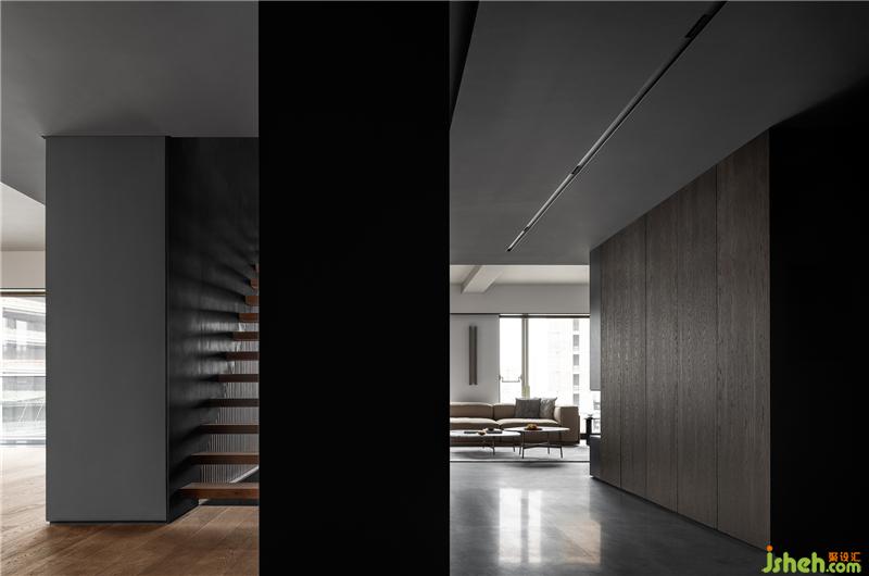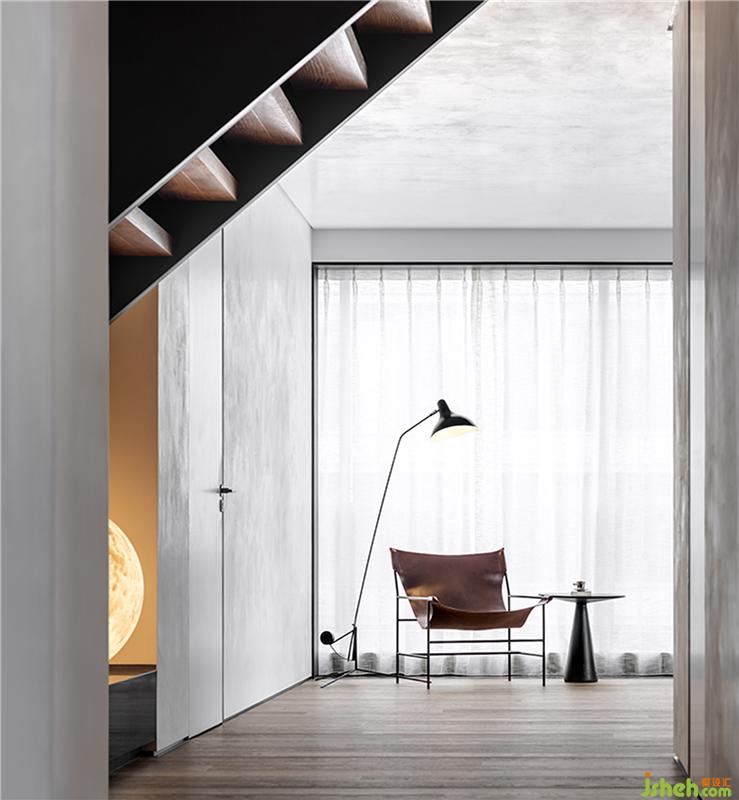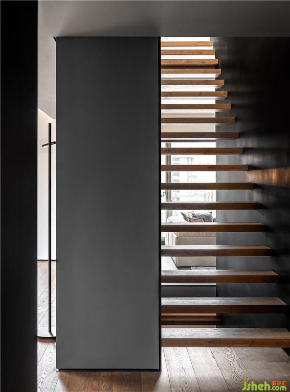 樓梯的位置經(jīng)過設(shè)計(jì)師多次反復(fù)調(diào)整,基于整體布局,以及對(duì)橫向、垂直樞紐便捷性的把握,最終確立其所在。木質(zhì)踏步的鏤空排列,呈現(xiàn)輕盈的懸浮感,又順暢的將光照引入,材質(zhì)的應(yīng)用在冷暖調(diào)和中也顯得剛?cè)嵯酀?jì)。