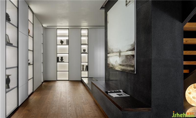 以層疊關(guān)系將樓梯銜接而下,并有效利用臺(tái)面的高度差,設(shè)置座位形式,兩側(cè)立面格架與柜體將實(shí)用與美感合二為一,藏秀并舉,這方樞紐也可作為樓下層的活動(dòng)區(qū)域。