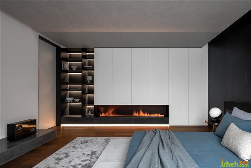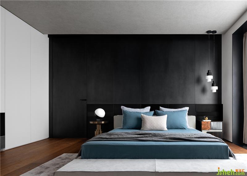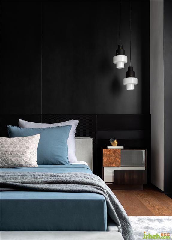 豪宅之所以“豪”,非但在于“大”,豐富的細(xì)節(jié)亦理應(yīng)值得考究。主臥在點(diǎn)線面的排布中有著熟稔自如的轉(zhuǎn)換,在黑白灰的圍合中飽含深情。床頭采用方磊慣用的三角構(gòu)成手法,既打破對(duì)稱式單調(diào),又構(gòu)成了入室的視覺落點(diǎn)。所選取的燈飾本身也滲透著設(shè)計(jì)師的精巧心思,與臥室渾然相融,增添一抹柔情的點(diǎn)睛之筆。
