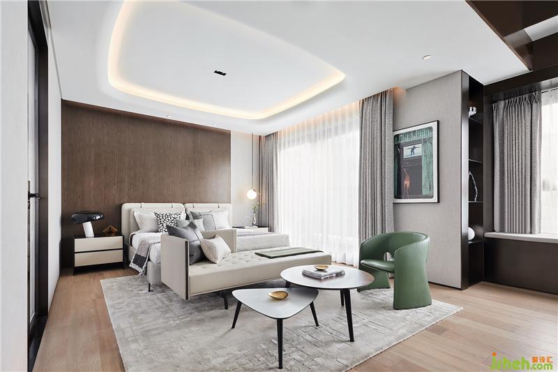 溫潤的木與柔和的米色調(diào)鋪陳主臥睡眠區(qū),散發(fā)出一種雅致溫馨的韻味,藉由皮革、布藝與木質(zhì)自如融合,予人安心怡然之感。復式裝修設計