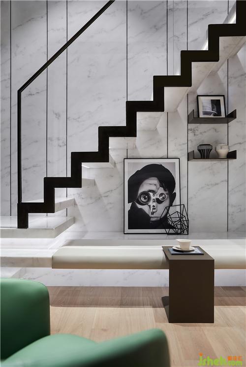 樓梯以平臺延伸的形態(tài)充當踏步的前奏,柱體和球狀的組合關(guān)系,也延續(xù)了積木盒子的概念,在嫻熟的結(jié)構(gòu)處理中演繹場域的力量與美感。隨一體下垂的吊燈盤旋而上,似乎離幸福也更近了。