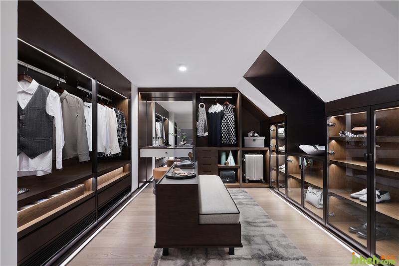 頂部閣樓因勢化身為專屬衣帽間,實現(xiàn)對閑置區(qū)域的最大化利用,也力求功用與美學(xué)的完美融合。陳列分區(qū)理性而細致,斜頂洞口的開啟,及燈帶的適宜設(shè)置,彰顯出細膩的柔情與不俗的品味。