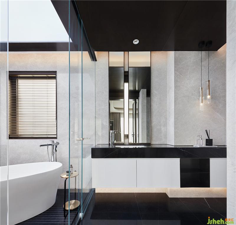 玻璃天井圍合出主衛(wèi)浴室,以上下通透的形式,加強了室內(nèi)外的交融與對話,渲染出日照光影、夜觀星空的愜意狀態(tài),顯得寧靜而美好。