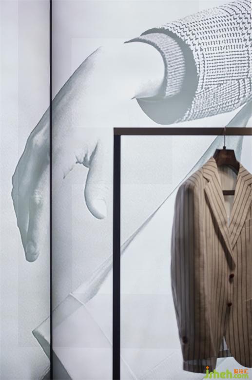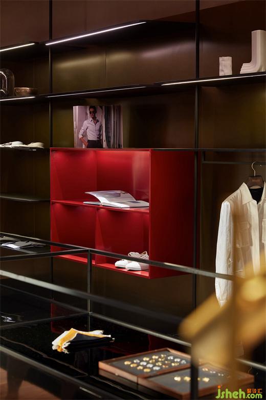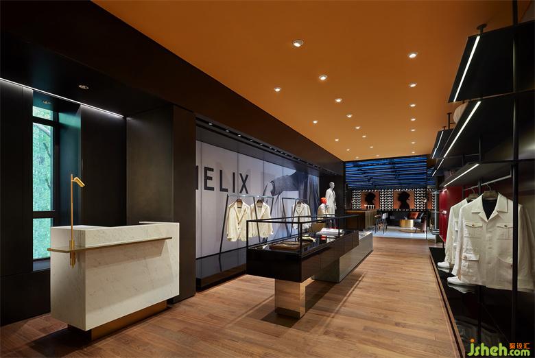 男裝店鋪設計以內凹的BOX體塊,結合大面燈箱的使用,構造出室內櫥窗之感。根據(jù)前端的產(chǎn)品陳列樣式,亦可對燈箱實行全色域控制,使二者協(xié)調契合,另一方面也預留更多的可塑性。