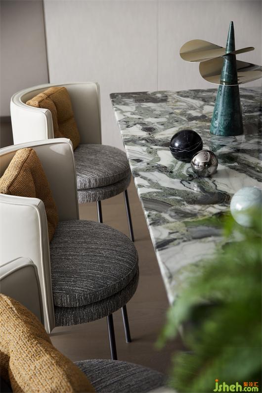 餐廳所處的位置,于某種意義而言也是樞紐中心。除去要規(guī)劃好它與各功能分區(qū)的動線關(guān)系之外,對其在入口處或是客廳等各個視角的呈現(xiàn)也需要慎重考量。冷翡翠桌面紋路飽滿,充滿張力,恰如其分的與吊燈上下輝映,顯得立體且完整。