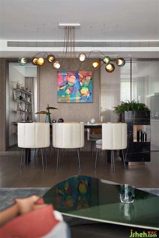 室內(nèi)各種色澤的運(yùn)用,似乎都可從餐廳背景墻上的畫作《光的呈現(xiàn)》里得以溯源,以抽象的筆觸描繪出具象的有序與變化,也增添一抹矚目且歡暢的光芒。目之所及,錯落有致的關(guān)系、直線弧度的碰撞、剛?cè)峒鏉?jì)的包容,共同助力藝術(shù)的高雅與生活的煙火氣和諧交融。
