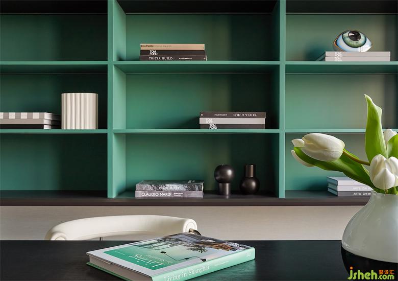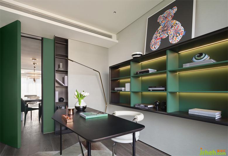 精神疆域的豐盈也是樣板間設(shè)計(jì)追求之一,書房內(nèi)規(guī)整的半吊柜空懸,不規(guī)則書桌與地毯的契合使用,加以個(gè)性藏品的點(diǎn)綴,凝練著思維廣度與高雅氣質(zhì),在此辦公與收藏兩者皆可全。