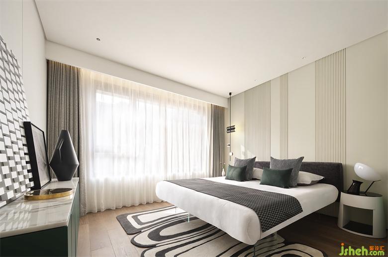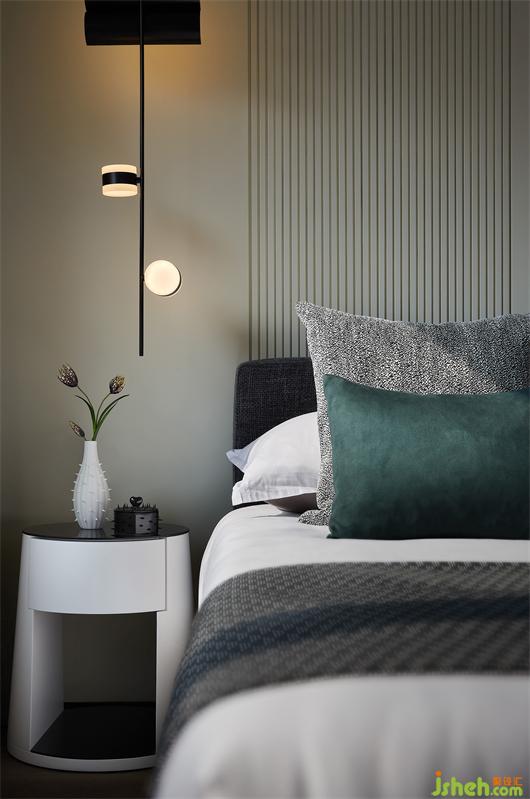 主臥床背景以質(zhì)樸有序的線條加上適當(dāng)?shù)牧舭祝瑯O富韻律,給人松弛平靜之感。樣板間設(shè)計(jì)半懸浮的床體工藝頗為考究,打破常規(guī)認(rèn)知,在承重與輕盈的最大化平衡中,帶來無限暢想與別樣情趣。
