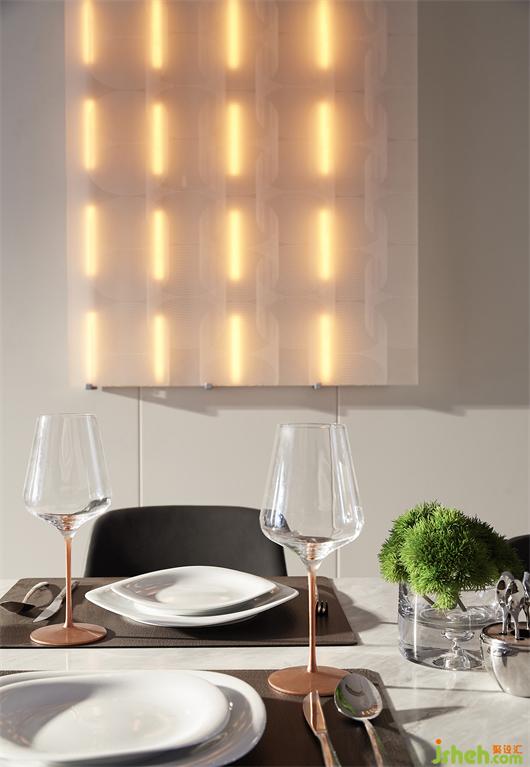 餐廳以自由的動(dòng)線、適宜的尺度調(diào)動(dòng)著空間的靈活性與凝聚力,自如的銜接起客廳與廚房。燈光裝置,既是背景,更是點(diǎn)睛之筆。對(duì)體量關(guān)系以及輕盈狀態(tài)的掌控,也讓這一隅呈現(xiàn)出流動(dòng)之美,極具呼吸感。