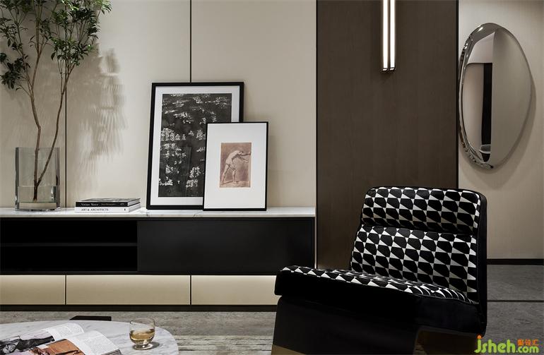 尺度闊綽從容,動(dòng)線優(yōu)雅流暢,愜意之感自客廳撲面而來(lái)。電視背景墻以木飾面和皮革做拼接,層次感十足,軟裝陳設(shè)亦強(qiáng)調(diào)功用,南京樣板間設(shè)計(jì)拒絕過(guò)多裝飾,加以色彩、肌理的呼應(yīng),干練利落,也呈現(xiàn)出理性的輕奢調(diào)性和高雅的審美體驗(yàn)。