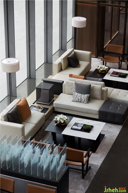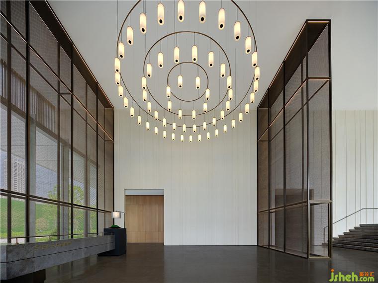 高挑空前廳內(nèi)的定制金屬屏風(fēng)、木百葉與石材悄然間流露著東方意蘊,明朗且舒緩。售樓處設(shè)計吊燈則以圓形、線性、陣列式的重復(fù)元素強化儀式感,剛?cè)峒鏉?,一派包容之意,氣度非凡?