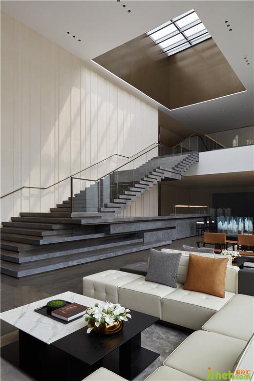 頂部借由建筑優(yōu)勢(shì),打通室內(nèi)與環(huán)境之間的聯(lián)系,光影從天井中向下灑入,拾階而上似乎與天空更近一步。售樓處設(shè)計(jì)在格局與調(diào)性的渲染下,親近自然之余,也頗具震撼之感。