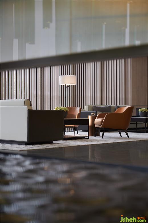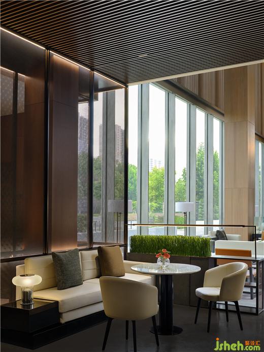金屬線(xiàn)條延伸至休憩區(qū),這里不再大開(kāi)大合,典雅的色度引導(dǎo)著思緒沉淀下來(lái),落座一隅,溫柔交互,理想都市生活的情趣與自由縈繞四周。